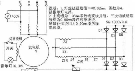 柴油發(fā)電機組實質是臺三次諧波自勵磁凸式三相四線同步發(fā)電機,因具有輸出功率大、適合移動等優(yōu)點,故廣泛用于廠礦、工程施工等場合。雖然功率不同的發(fā)電機,其繞組數(shù)據有所不同,但電路連接基本相同。