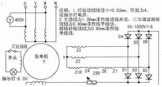 柴油發(fā)電機(jī)組實(shí)質(zhì)是臺(tái)三次諧波自勵(lì)磁凸式三相四線同步發(fā)電機(jī),因具有輸出功率大、適合移動(dòng)等優(yōu)點(diǎn),故廣泛用于廠礦、工程施工等場(chǎng)合。雖然功率不同的發(fā)電機(jī),其繞組數(shù)據(jù)有所不同,但電路連接基本相同。